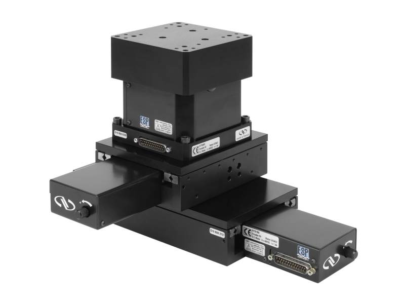 A GTS150 linear stage (X-axis), a GTS70 linear stage (Y-axis) and a GTS30V vertical stage (Z-axis) mounted directly to each other for high accuracy and resolution in three axes of linear motion.