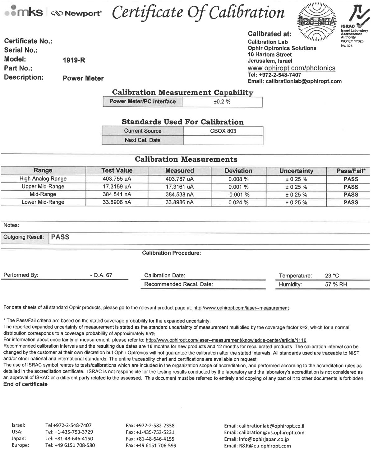 Newport certifies calibration performed using standards traceable to the National Institute of Standards and Technology (NIST) and other recognized national standards laboratories. Included with your new instrument is a comprehensive calibration report. Newport also recommends recalibration every 12 months.