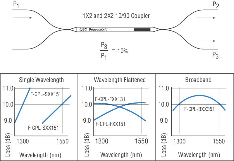 - Low optical loss 1x2 and 2x2 fused couplers