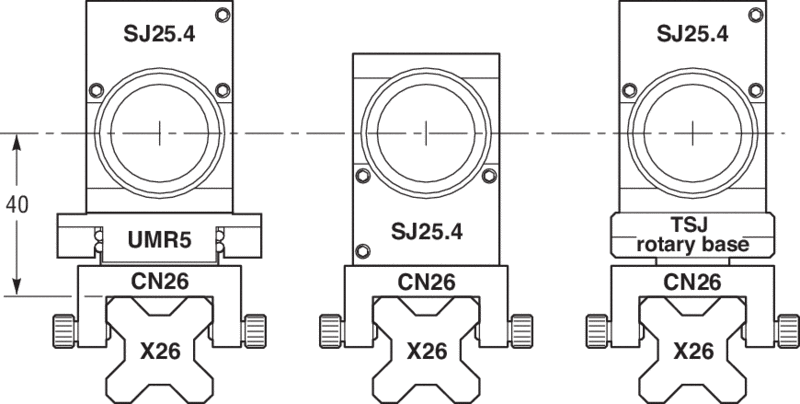 Multiple optical mount options are designed to work well with X26 optical rails by providing a common optical axis height. Compatible optical mounts include SL Series 1.0 in. Gimbal Optical Mounts, SB18YZ Series Lens Positioners, X26 Series Optic and Lens Barrel Mounts They all provided a common optical axis height of 40 mm above the rail surface. The allows for easy optical system construction.