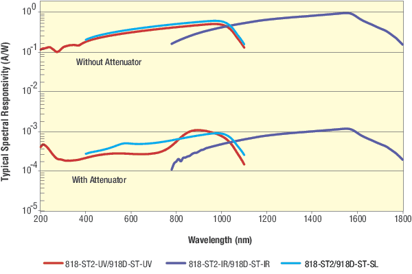 918D Series photodiode sensors feature a built-in attenuation filter that is engaged with an On/Off switch. Compared to our earlier 818 Series detectors with a removable threaded OD3 attenuator there are no worries about misplacing it. An attenuator On/Off position sensor lets connected Newport power meter models 1936-R, 2936-R, 1919-R and 841-PE-USB know when the attenuator is present so the the power readings can automatically be adjusted. 918D sensors are available with OD1 (10x), OD2 (100x), or OD3 (1000x - except for the UV model) attenuators.