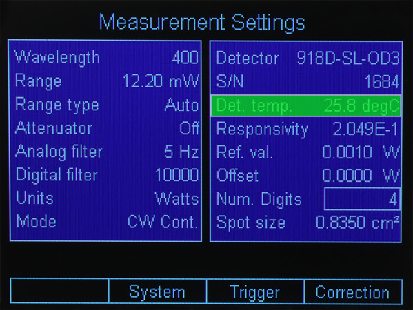 The internal temperature sensor on the detector head is used to compensate the responsivity drift caused by the temperature change in the photodiode. The responsivity change is most sensitive around the bandgap, or towards the longer wavelength limit. The power meter calculates the temperature and automatically updates the responsivity value so that the measurements remain accurate. This feature is enabled with the power meter models 1936-R, 2936-R, 1919-R, and 844-PE-USB.