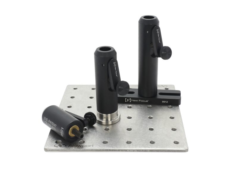 The cam-lock mechanism of these patented post holders, when locked, wedge optical posts tightly against two lines of support to provide a more rigid hold than typical optical post holder designs. The cam-lock is easily operated with one hand while an optical post is positioned in the holder, where releasing holds the post in place and a final, secure hold is provided by a thumb-turned screw. Clamping and releasing does not introduce rotation or translation to optical posts, unlike those locked with single thumbscrews. Quick adjustments can also be made by pushing in the locking screw.