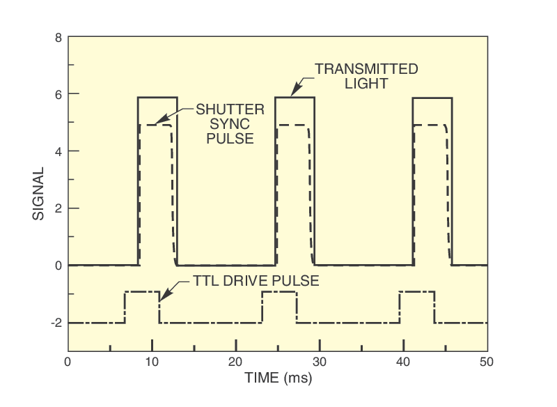 All shutters include a fast synchronizing sensor activated by a vane attached to the shutter blade. The sensor sends out a TTL signal when the shutter is greater than 90% open. The signal is available at a BNC connector at the rear of the controller.