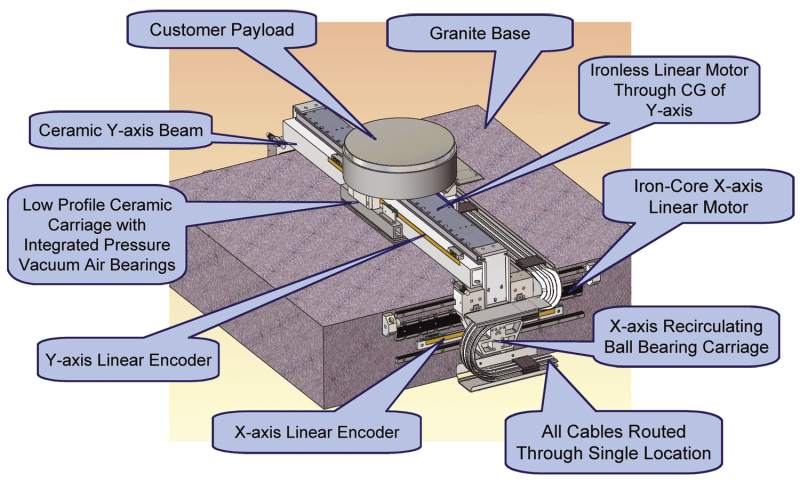 HybrYX stages blend the cost-effectiveness of mechanical bearings with the precision of a single plane air bearing carriage to deliver a powerful combination of throughput, precision and value. During motion, a ceramic carriage freely slides in X and Y on a precision lapped granite reference plane using a proprietary pressure-vacuum air bearing design. This XY carriage is pressure-vacuum preloaded to, and guided along the Y-axis by a rigid and lightweight ceramic beam. The beam is supported (and guided) at each end by recirculating ball bearing carriages resulting in a low-profile design that is extremely rigid, well-damped, and capable of quick & precise point-to-point moves and exceptional high-speed scanning performance. For large payloads, such as Generation-5 LCD display or Photovoltaic panels, the HybrYX-G5 offers an oversized carriage with higher air bearing load capacity on both the horizontal and vertical reference surfaces.