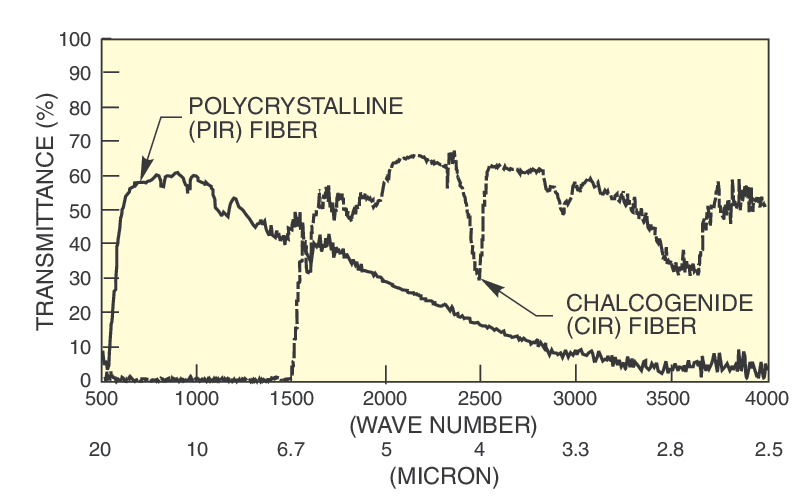 These infrared (IR) fibers are convenient for guiding light from a sample to a monochromator or photodetector or from a monochromator to a sample. Two specific fiber types are offered, differing in core material and structure and jacket material to provide optimum IR light transmission performance within their respective wavelength regions.