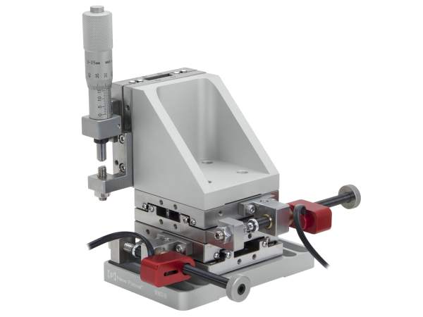 These gothic-arch ball bearing stages feature side-mounted actuator clamps, minimizing the final footprint while maintaining a low profile height. Motorized axes feature our 8303 picomotor actuator and provide 25.4 mm of travel. Manual axes feature our 9356 smooth-bore micrometer heads and provide 25.4 mm of travel.