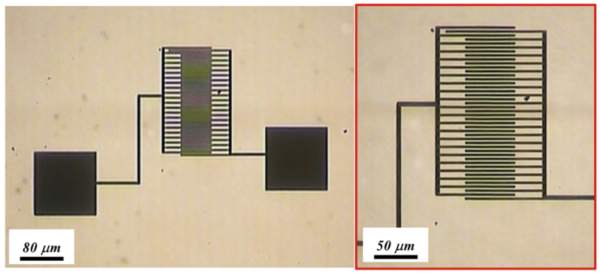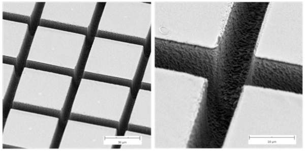 The Laser µFAB™ is an excellent tool for driving spatially controlled deposition of metals. Patterns covering areas as large as squared centimeters can be written with features sizes on the order of microns. The Laser µFAB permits direct writing of several metals (Ag, Au, Cu, Al) with high efficiency. Laser assisted deposition of metals is achieved using easy-to-prepare gel matrices in which nanoparticles of the metal of interest are imbedded with stabilizing agents.