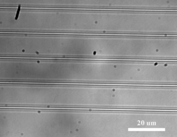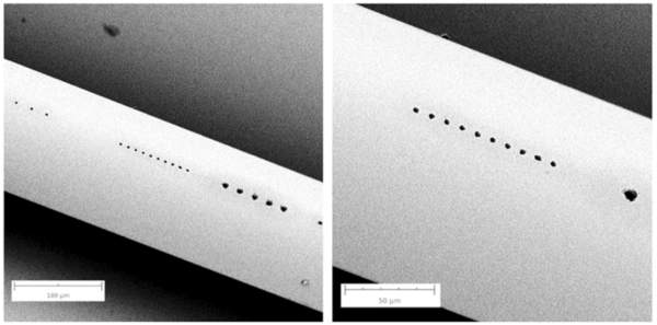 The Laser µFAB™ has the accuracy and repeatability that are indispensable for precise microfabrication of optical fiber. By using the fundamental emission of Spectra-Physics Spirit laser (1040 nm) as the excitation source, drilling of holes on the surface of stripped optical fibers is possible. Modulating the laser exposure time, permits the creation of holes with different diameters and depths.