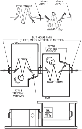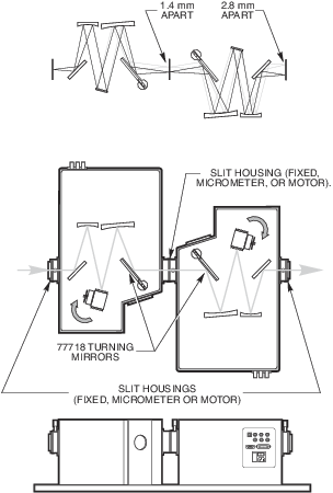 Two MS257 monochromators, configured with identical gratings and three slit assemblies, can be mechanically coupled via a light tight connection and mounted to a single baseplate to hold the proper optical alignment. Dual monochromator configurations are only controllable via RS-232. An additive double monochromator configuration uses the second monochromator to provide a second level of dispersion from the output light of the first monochromator. The result is linear light dispersion approximately double that of a single monochromator (ignoring all aberrations), and slightly better resolution. Contact a Newport Sales Engineer for assistance in configuring a double monochromator system.