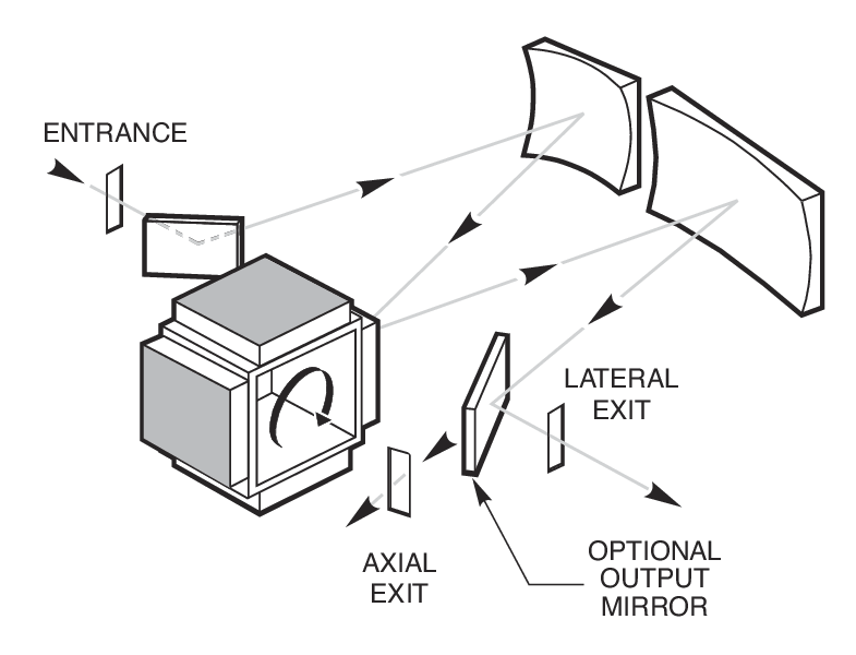 Newport's patented quadruple grating turret assembly holds four gratings. Our wide selection of grating configurations enable this one instrument to perform extended wavelength range scans beginning in the ultraviolet (UV), and extending into the visible and near-infrared (NIR) wavelength regions. Users can choose from a variety of options that meets the wavelength scanning range and/or resolution requirements of his/her application. Custom grating requirements such as gold or AlMgF2 coatings are also available upon request. A wide offering of MS257 models are available based on grating selection, micrometer driven or motorized slit assembly, and single (axial) or dual output port access. For more information on the advantages of each option, see below. For a full listing of each model number, click here. Please contact your Newport Sales Engineer for assistance in selection or purchasing a specific model.