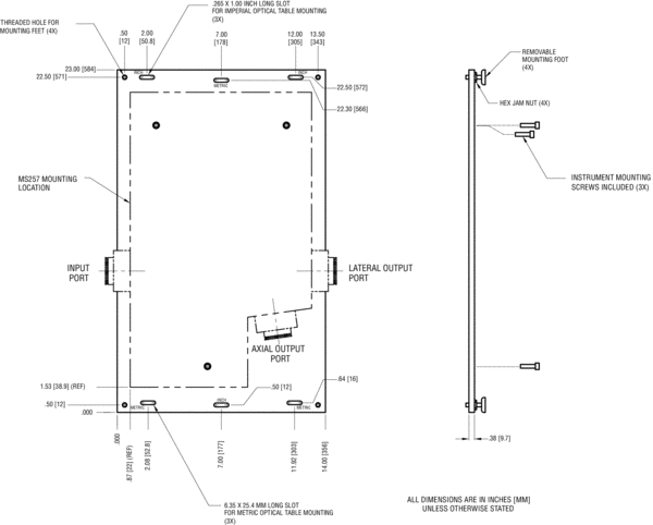 ·TTL signal as well as auxiliary input and output connectors are located on the back panel of the MS257. The TTL signal enables control of select functions such as the integrated shutter and output port mirror, for dual output port models.