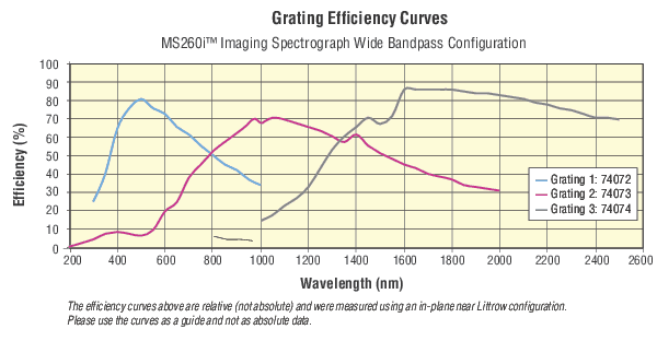Wide Bandpass MS260i imaging spectrographs come with three general purpose ruled gratings that are installed and aligned on a triple grating mount. A high precision motor is used to select the desired wavelength and switch between three diffraction gratings quickly, without sacrificing performance.