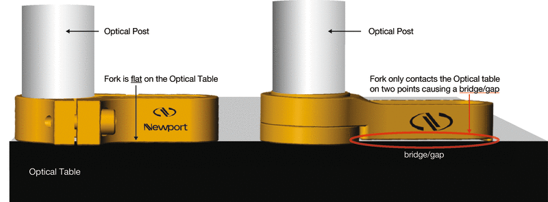 Non-Bridging Post Clamps are in full contact with the underlying optical table or breadboard along their entire length, eliminating any localized deformation of the clamp, optical table or breadboard when tightening the mounting screw. Non-bridging clamps therefore greatly reduce any potential optical pitch/yaw misalignment introduced due to torque effects on the slot clamping mechanism.