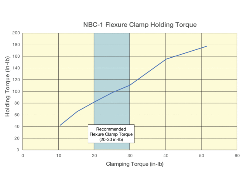 NBC-1 was used in this test and first mounted to an optical table. The flexure clamping cap screw was tightened by a torque wrench to specific torque values. An increasing rotational torque was applied to the optical post until it moved within the clamping arm's bore. The torque value right before it moved was recorded as holding torque.