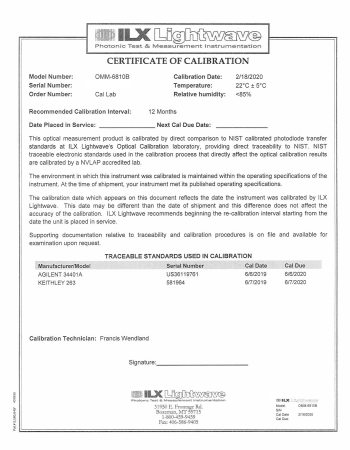 The OMM-6810B and OMH-6700 Series Measurement Heads are calibrated to NIST traceable standards in our own calibration laboratory where accuracy and traceability are our primary concerns. Our documented quality system ensures conformance to continuous traceability and ultimately your confidence in the power/waveheads’ measurements.