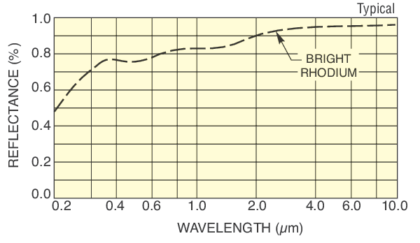 Our reflectors are made of electro-deposited nickel replicated from a precision master. The substrates are typically 0.03 inch (0.76 mm) thick. The bright rhodium coating has good reflectance in the UV and visible range, and excellent reflectance from the near to far IR.