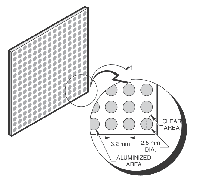 These beamsplitters are coated with aluminum and SiO protective overcoat in a "polka dot" pattern. The pattern is a series of aluminum dots, 2.5 mm in diameter, separated by a 3.2 mm center-to-center distance. Light is reflected by the metal-coated areas of the beamsplitter and transmitted through the uncoated areas of the beamsplitter.