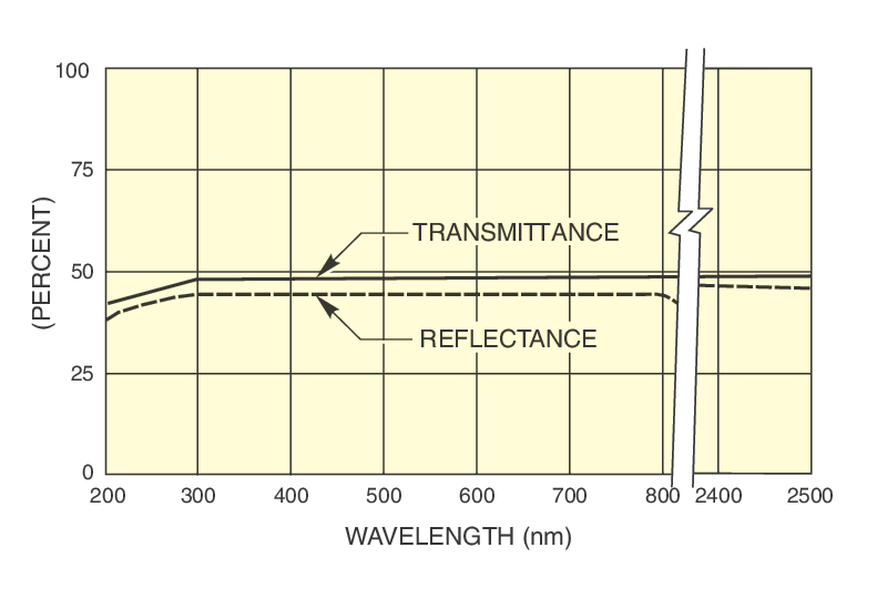 - 50% reflectance, 50% transmission from 250 to 2500 nm