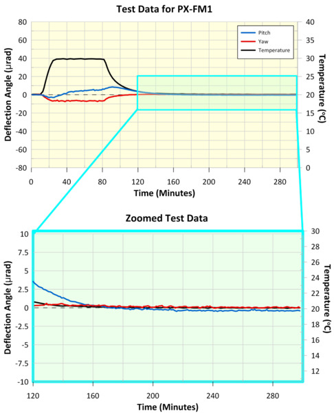 The maximum deflection of the PX-FM1 mirror mount during peak temperature was 10 µrad in pitch and 8 µrad in yaw, and the shift in reflected beam position after temperature cycling was < 1 µrad in pitch and < 1 µrad in yaw. This demonstrates the mount's excellent thermal properties. Further details are shown in the accompanying graphs.