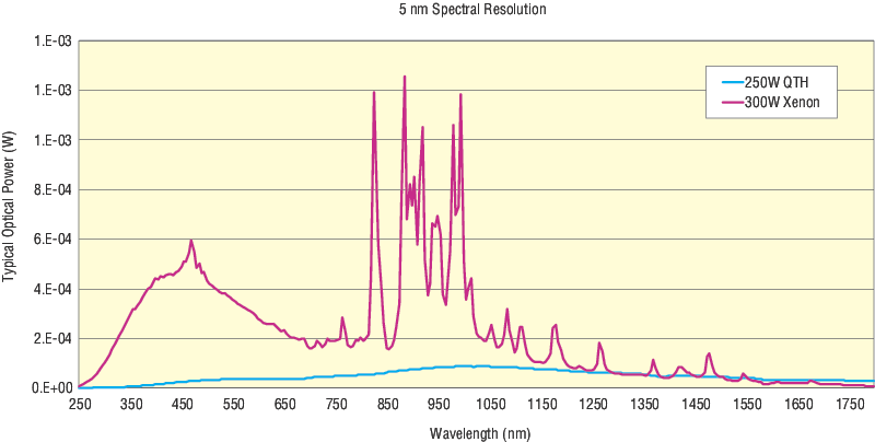 - Spectral Output Irradiance with both 280 µm and 600 µm slits installed from 300 to1650 nm for Xe source or 350 to 1650 nm for QTH source