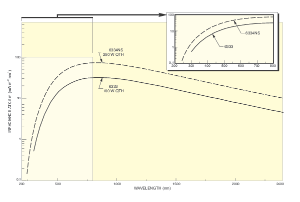 - Spectral Output Irradiance with both 600 µm and 1240 µm slits installed from 300 to 1650 nm for Xe source or 350 to 1650 nm for QTH source