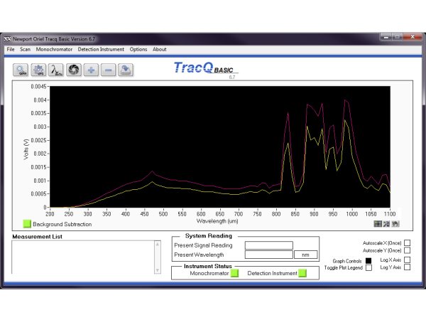 The TLS260B includes the latest, most advanced version of Oriel’s TracQ Basic Instrument Control and Data Acquisition software. Using the 1/4 m Cornerstone 260B Monochromator's USB or RS232 port, TracQ switches the filter wheel position to the correct order sorting filter and the monochromator to the proper grating and position based on the TLS output wavelength chosen by the operator. When used with a compatible Newport Power Meter and Detector, TracQ is a complete radiometry system control software, capable of displaying real time data acquisition. No prior knowledge of software programming is necessary to install or operate TracQ. Some of the scans made possible with the TLS by TracQ include: