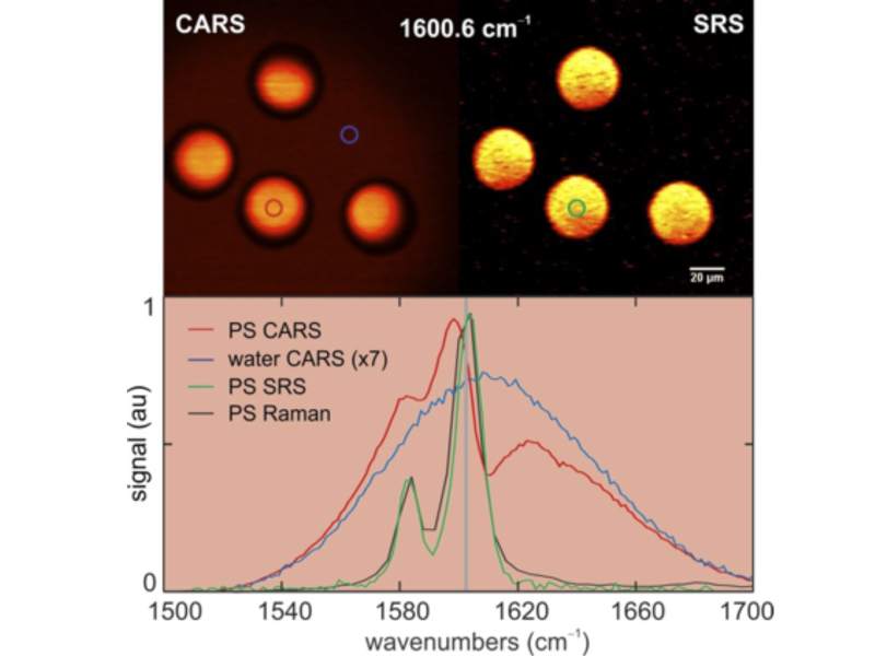 Top: Hyperspectral CARS (left) and SRS (right) images of polystyrene (PS) beads. Slices from stacks of hyperspectral scans are shown. Chirped pump and Stokes wavelengths are 893 nm and 1041 nm, respectively. Red, green and blue circles indicate the regions of interest (ROI).