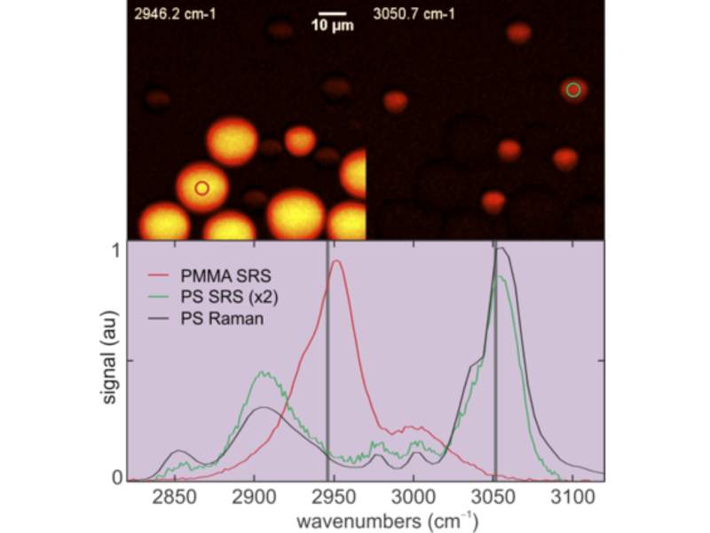 Bottom: SRS spectra of PMMA (red) and PS (green) beads extracted from the hyperspectral scan shown with spontaneous Raman spectrum of PS (black). The vertical bars correspond to the Raman shifts of the frames shown on the top.