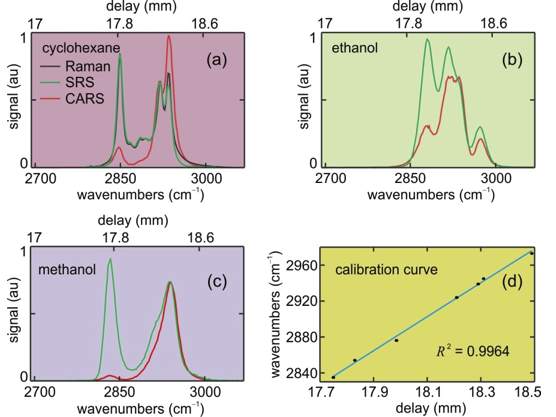 (a – c) SRS (green) and CARS (red) spectra of cyclohexane, ethanol and methanol measured by SF-TRU. Chirped pump and Stokes wavelengths are 797 nm and 1041 nm, respectively. The spontaneous Raman spectrum of cyclohexane (black) in (a) shows excellent agreement between spontaneous Raman and SRS spectra. (d) Delay-to-wavenumber calibration curve for hyperspectral imaging obtained from the Raman shift measurements shown in (a – c).