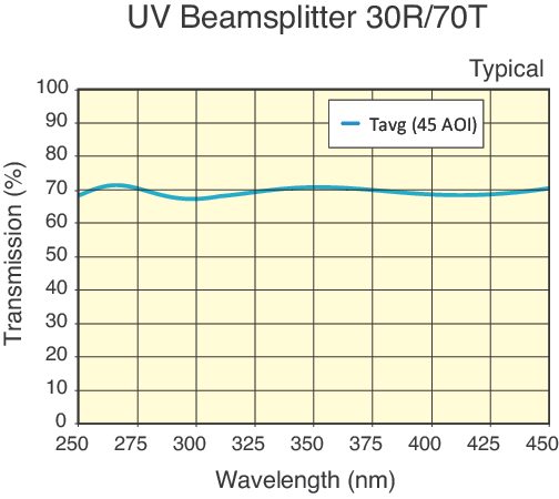 The UV beamsplitters are designed for a 45 degree angle of incidence, and are available in 50/50 and 30/70 reflectance/transmittance ratios in 250-450 nm spectral range. The choice of the beamsplitting ratios allows the scientist to use this beamsplitter in multiple applications that may require an even split or a 30/70 split. The beamsplitters are also provided with a broadband anti-reflection coating on the back surface to minimize any ghosting.