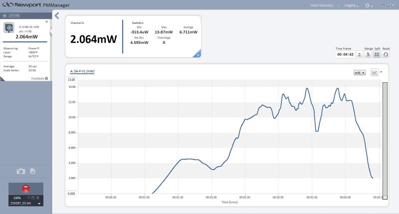 PMManager™ is a powerful application software controlling and taking measurement data. It turns a PC into a laser power multi-channel analysis workstation. The PMManager software features include: extensive graphic display of data, advanced measurement processing, data logging for future review, printing of graphs and data, and the ability to connect additional devices during active measurements. The PMManager software package includes the latest PMManager user manual, the COM object manual, the available user command lists, and automation examples written in various programming languages. Please see the PMManager Tutorial for more details regarding its capabilities.