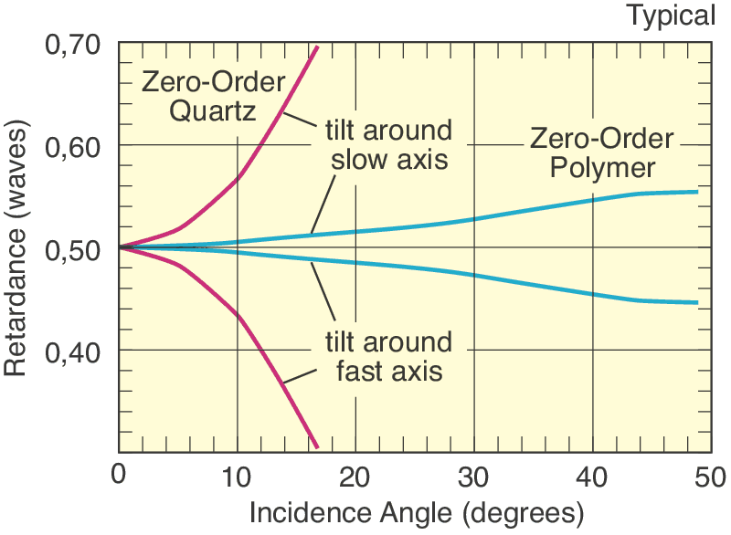 Zero-order wave plates offer several distinct advantages over multiple order wave plates. The primary benefit is a moderate insensitivity to wavelength change, making them ideal for laser diode or tunable laser applications. For example, a zero-order wave plate designed for 780 nm will provide useful retardance from 765–795 nm.