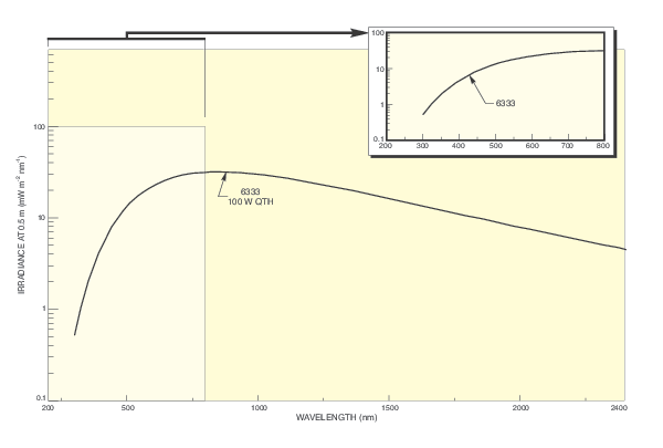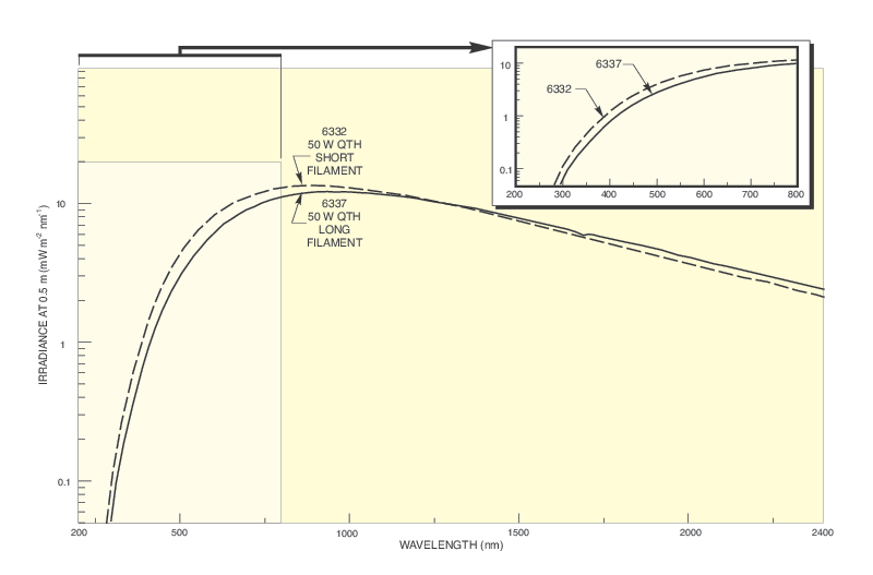 Two different 50 W QTH lamps are offered. The 6332 is a short filament type QTH lamp. Short filament QTH lamps have better shock and vibration due to their compact construction and can be more useful for reimaging the filament onto a small input slit of a monochromator, for example. The 6337 is a long filament type QTH lamp. Long filament QTH lamps have an extended average lifetime.