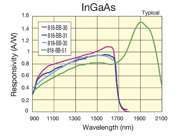 The 818-BB-30, -31, and -35 consist of free-space, small and large area InGaAs detectors, with rise times ranging from 300 ps to 1.5 ns for covering the 1000-1600 nm wavelength range. Each unit includes a built-in bias supply consisting of standard 3 V lithium cells and a 50 ohm BNC connector output. The 818-BB-51 features an extended InGaAs photodetector with a wavelength range of 1475–2100 nm.