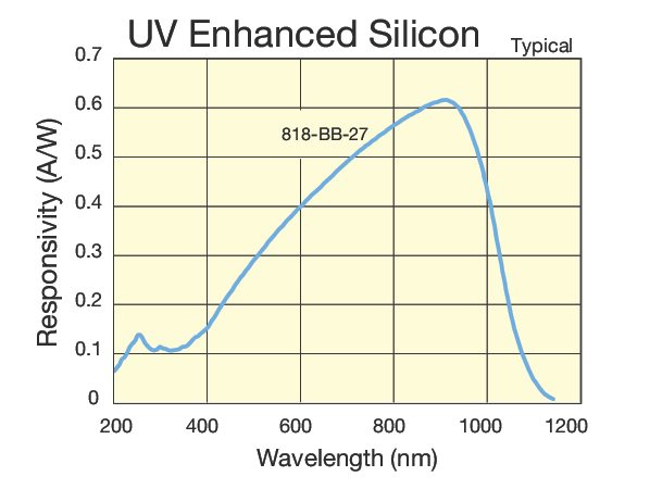 The 818-BB-27 consists of a silicon detector with an enhanced ultraviolet response, making it well suited for the fourth harmonic Nd:YAG, YLF or Glass Lasers and Excimer Lasers. Additionally, its large active area and fast response time make it an excellent general-purpose biased detector for the 200 to 1100 nm wavelength region. To attain its fast response, this detector comes with a 24 VDC external power supply.