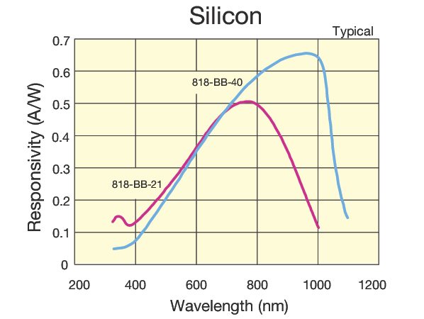 The 818-BB-21 and -40 consist of free-space, small and large area Silicon detectors, with rise times ranging from 300 ps to 1.5 ns. Each unit, other than the 818-BB-40, includes a built-in bias supply consisting of standard 3 V lithium cells and a 50 ohm BNC connector output. The 818-BB-40 comes with an external 24 VDC power supply.