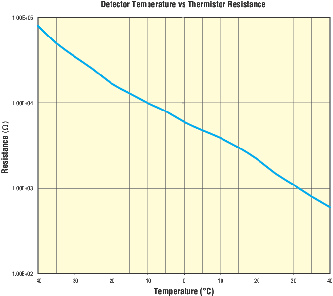 The 71582 TE cooled detector head of the LIK-LMP Light Intensity Controller Kit utilizes a 1-stage TE cooled detector. When used with an OPS Series Power Supply, the temperature of the Si detector can be adjusted from 0 to 25 °C. Cooling the detector below 0°C as shown in the plot to the right is not recommended. In order to cool the Si detector greater than 25 °C below ambient temperature, specialized heatsink requirements not built into the 71582 must be utilized due to the current consumption of the TE cooler at those temperatures.