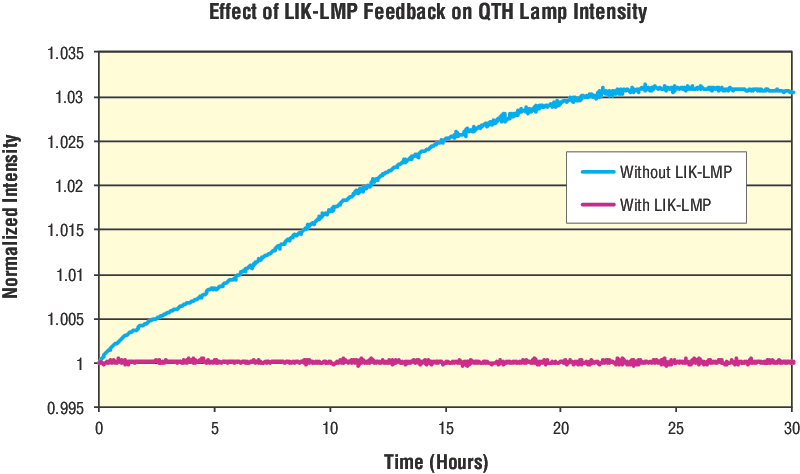 For shorter periods of lamp operation, drift may not be a problem. However, ripple, or output intensity fluctuation associated with shorter periods of lamp operation, may be a problem. The LIK-LMP also improves light ripple characteristics for short term operation periods of an arc lamp. A 0.35% improvement in light ripple has been observed by using the LIK-LMP.