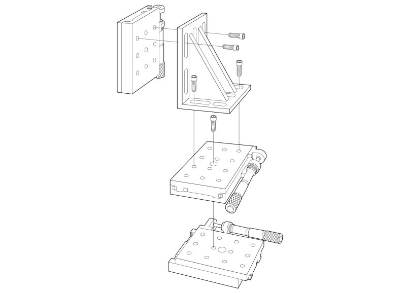 The M-360-90 Angle Bracket is a rigid 90° angled mounting plate with 25 mm separated slotted faces for use with either 1/4-20 or M6 threaded mounting bolts. The 90° angle is accurate to within ±2 arc min.