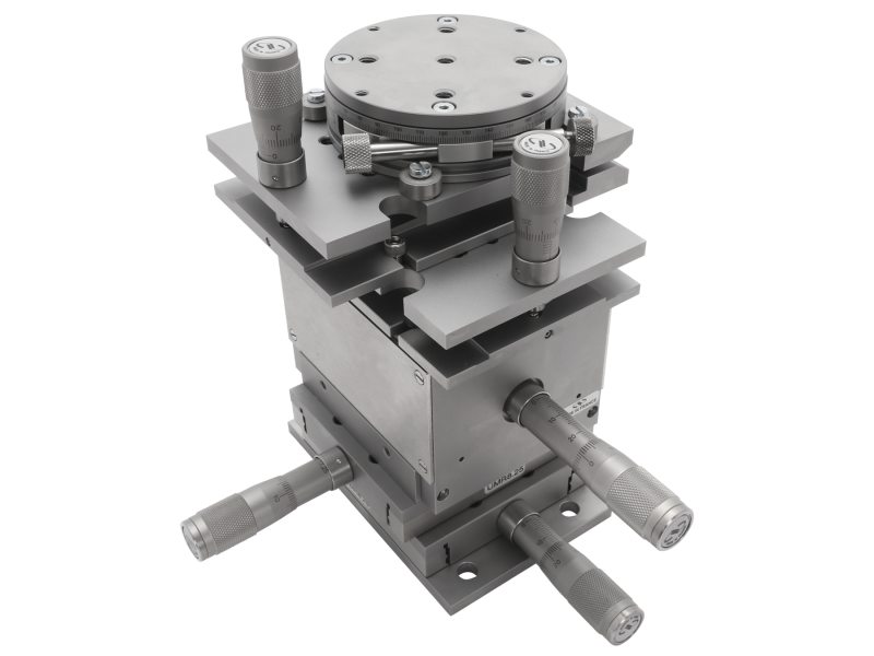 The TGN Series Tilt Platforms are compatible with UMR Steel Linear Stages, UTR Steel Rotation Stages, and MVN Precision Vertical Stages of matching size (for example, TGN80 with UMR8.25 and UTR80, or TGN120 with UTR 120 and MVN120). They can be combined to provide multi-axis motion and can be easily adapted to fit a specific system's needs. In the picture, a six-axis manual positioning system is shown using two UMR8.25s, two TGN80s, a UTR80S, and a MVN80. (Hint: first assemble Y & Z stages from the backside of Y stage, and then connect X stage to YZ from backside of X. In both steps, the carriage of UMR stage needs to be translated to each end of the travel range to reveal access holes, please refer to UMR stage XY assembly video.)