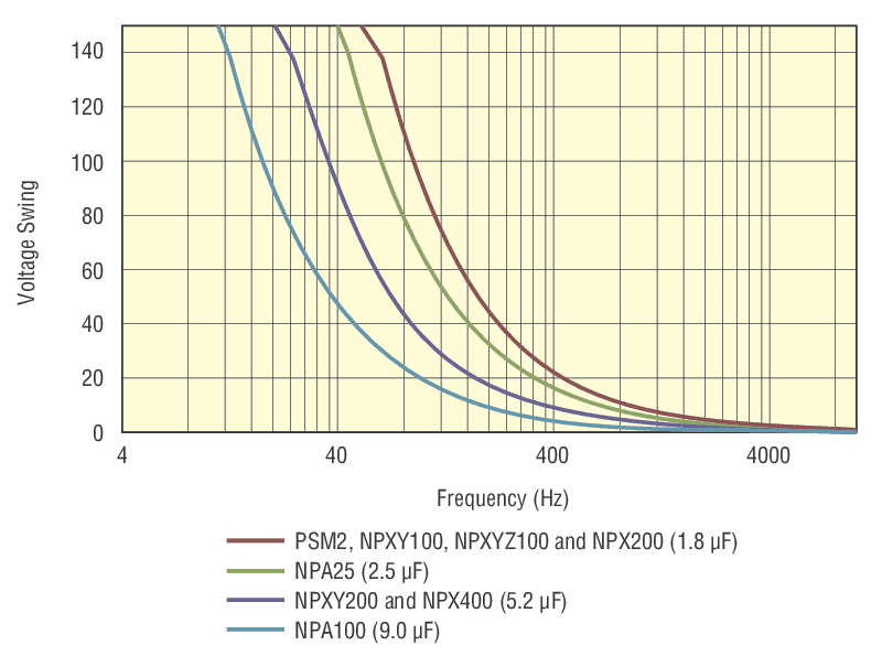 Another boundary for fast open-loop operation is the current that can be provided by the piezoelectric amplifier. The diagram displays the max. sinusoidal frequency which can be supplied by the NPC3 and NPC3SG amplifiers as a function of the capacitance of the piezoelectric transducer and the voltage amplitude. For other models please see user manual for drive frequency curves.