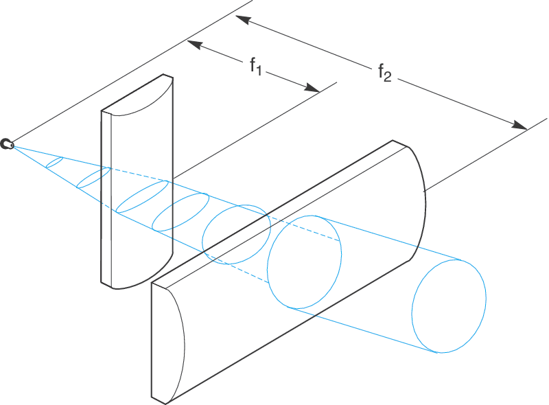 In a typical laser diode (a P-i-N diode), electrical current flows vertically between contacts on top of and below the semiconductor material substrate. Charge carrier combination and the resulting light emission occurs in the intrinsic region between the doped electrodes. A horizontal optical cavity is formed by cleaving the substrate and polishing the side faces. Fresnel surface reflections at these faces create optical feedback resulting in a lasing effect. Light emitted from a rectangular aperture typically takes on an elliptical beam profile with angle θ1 and θ2 along the major and minor axes. Two cylindrical lenses with focal lengths f2/f1 = θ1/θ2, each positioned their focal length away from the laser diode, may be used to produce a circular collimated beam output.