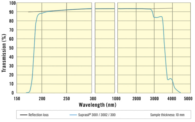 These lenses feature Heraeus Suprasil® 300 high‑purity synthetic fused silica substrates. Suprasil 300 is manufactured by flame hydrolysis and is characterized by ultra‑low metallic impurities (<1 ppm) and an exceptionally low OH content (<1 ppm), resulting in no absorption bands from the visible to the infrared spectral region. This significantly reduces bulk absorption and minimizes the risk of internal damage under high‑energy laser exposure. For more information, refer to the optical material tech note.