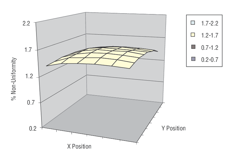 The irradiance uniformity over the working area is indicated by the second letter in a solar simulator class rating, and is the most difficult requirement to achieve and maintain. Hot spots can lead to significant errors in measured cell efficiency and can cause inaccurate binning of cells. The Class A spatial uniformity performance standard is designed to minimize the impact of hot spots and has a very stringent requirement of ≤2%. The plot shows the uniformity of the irradiance across a typical 2 x 2 inch simulator working area. Each unit will come with a plot of irradiance non-uniformity. For more information about solar simulator standards, please see our "Solar Simulator Standards — Definitions & Comparisons" technical note.