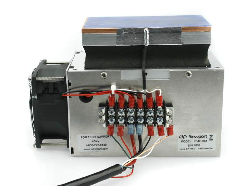The 764H Series high-power laser diode mounts use an industrial grade heat sink and cooling fan design to provide an air cooled thermal solution for high power laser diodes and bars. Both free-space and fiber-coupled diode laser bars can be accommodated with the flexible top mounting plate. When connected to Newport's 3700 High Power TEC Controller Model 764H-061 can dissipate up to 61 watts, and model Model 764H-110 can handle up to 110 W of waste heat at 25°C ambient temperature.