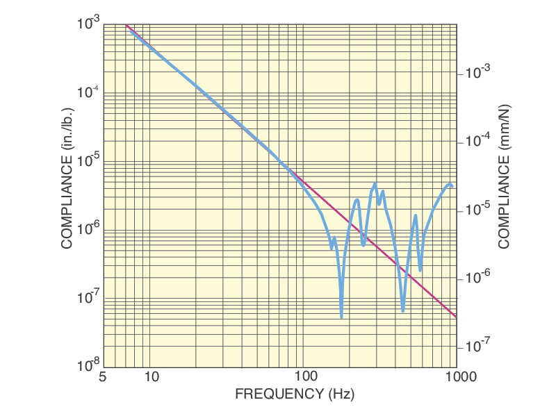 The optical table top in Integrity 3 VCS system features a 4.8 mm thick optical table skin, a constrained layer core, damped working surface and composite edge finish to provide broadband damping. One precision tuned damper is included to selectively eliminate a fundamental structural table mode and its entire harmonics. Integrity 3 VCS systems are ideal for electro-optical experiments that require moderate amount of damping. The compliance curve shows the positional motion of the structure for a given excitation force and frequency. The red line is the rigid body line showing how an ideal optical table would perform with no relative motion. The blue line shows the natural frequencies of the optical table and how they these deviate from that of a rigid body.