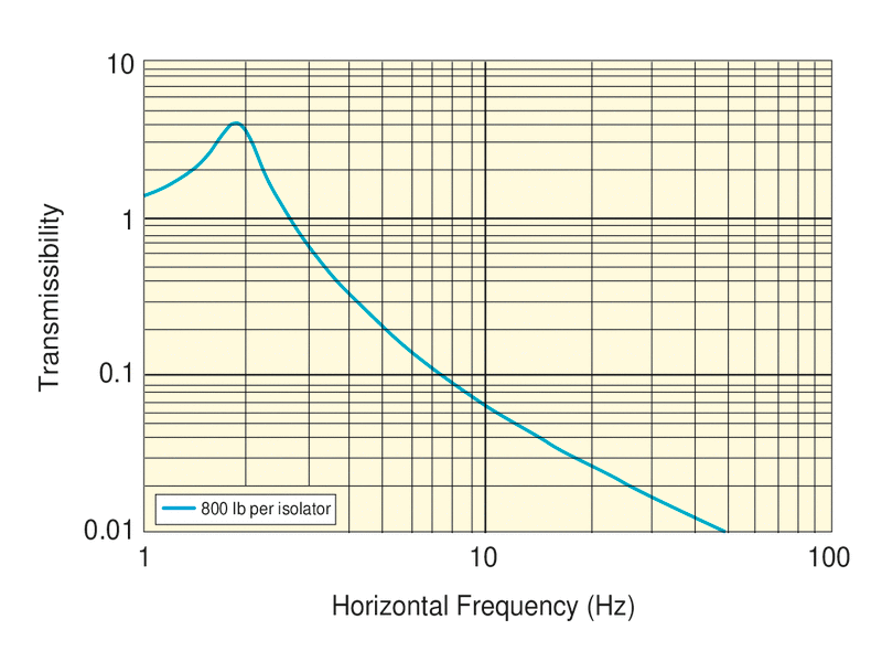 The pneumatic vibration isolators in the supporting frame feature our patented Stabilizer™ hybrid chamber design which consists of a small size initial chamber and a second damping chamber connected by a laminar flow disk. Because the initial chamber is reduced dramatically in size, it forces the isolator to use the second chamber as part of the compliance volume, which greatly increases the compliance volume for a given package size, and greatly lowers the natural frequency. Besides, our exclusive incorporation of the laminar flow damping element creates better linkage between piston motion and damping chamber air flow, which generates a higher damping force for a given piston displacement for faster, more efficient damping. It also lowers the amplification at resonance and improves isolation bandwidth and settling time. The vibration isolation performance is characterized by transmissibility curve which shows the mechanical filtering properties for the isolator leg - how much floor vibration will be transmitted through the leg to the table top.