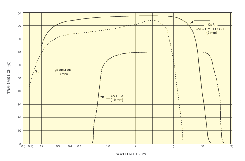Calcium Fluoride lenses are an excellent choice of material for UV to Near IR wavelengths (180 - 8,000 nm). It has a high average transmission and low chromatic aberration compared to various IR materials. In Near IR regime it has a very low GVD which makes it suitable for applications using femtosecond IR pulses. For more information, refer to the optical material technical note.
