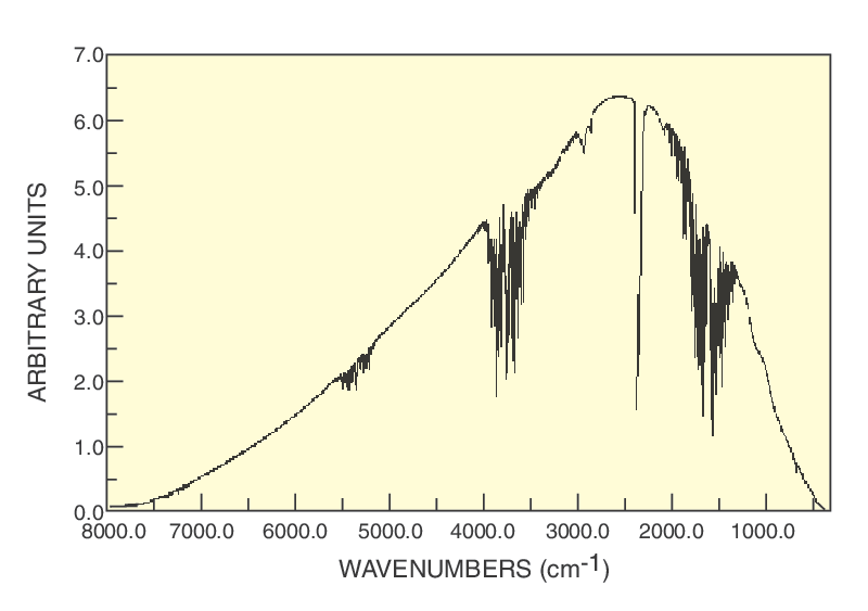 The 80007 is a complete silicon carbide (SiC) infrared light source that provides a smooth continuum from 6,000 to 400 cm-1 (1.7 to 25 µm). Its 1.5-Inch Series female output flange allows the source to be coupled to a variety of items, including FT-IR Spectrometer Building Blocks. An off-axis parabolic reflector is integrated into the design, rather than a condenser lens. IR refractive optics are expensive and have transmittance limitations. Using this type of reflector provides several advantages. Its gold coating enhances IR reflectance. The focal point is displaced from the mechanical axis, giving full access to the reflector focus area. The 80007 produces a 34.5 mm (1.36 inch) diameter collimated output beam with 1° divergence, full angle. A hose fitting is provided to purge the source with nitrogen, if desired. The 80007 includes a 24-watt SiC emitter and a stand-alone power supply designed to minimize light ripple. A 1 m (3.3 ft.) long cable connects the source to its power supply.